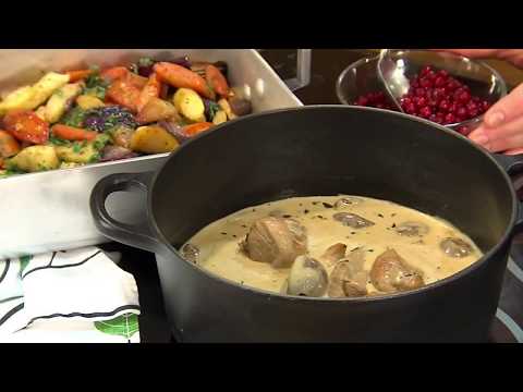 Krämig kycklinggryta – steg för steg | Arla Köket - Kycklinggryta - Lär dig laga en krämig kycklinggryta serverad med rotfrukter i ugn och syrligt goda lingon på toppen. Sveriges Mästerkock 2011, Louise Johansson, visar hur du ...